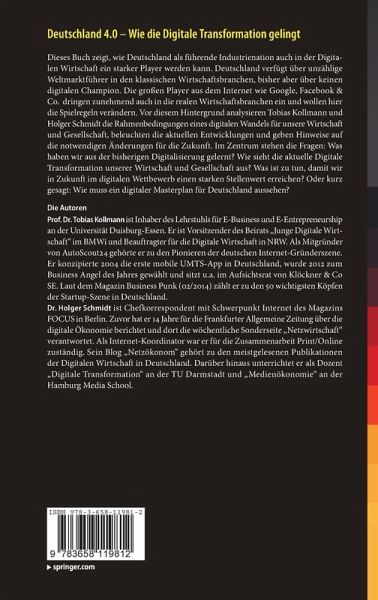 Dieses Buch zeigt, wie Deutschland als führende Industrienation auch in der Digitalen Wirtschaft ein starker Player werden kann. Deutschland verfügt über unzählige Weltmarktführer in den klassischen Wirtschaftsbranchen, bisher aber über keinen digitalen Champion. Die großen Player aus dem Internet wie Google, Facebook & Co. dringen zunehmend auch in die realen Wirtschaftsbranchen ein und wollen hier die Spielregeln verändern. Vor diesem Hintergrund analysieren Tobias Kollmann und Holger Schmidt die Rahmenbedingungen eines digitalen Wandels für unsere Wirtschaft und Gesellschaft, beleuchten die aktuellen Entwicklungen und geben Hinweise auf die notwendigen Änderungen für die Zukunft. Im Zentrum stehen die Fragen: Was haben wir aus der bisherigen Digitalisierung gelernt? Wie sieht die aktuelle Digitale Transformation unserer Wirtschaft und Gesellschaft aus? Was ist zu tun, damit wir in Zukunft im digitalen Wettbewerb einen starken Stellenwert erreichen? Oder kurz gesagt: Wie muss eindigitaler Masterplan für Deutschland aussehen?