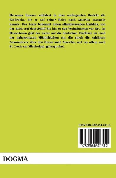 Hermann Knauer schildert in dem vorliegenden Bericht die Eindrücke, die er auf seiner Reise nach Amerika sammeln konnte. Der Leser bekommt einen allumfassenden Einblick, von der Reise auf dem Schiff bis hin zu den Verhältnissen vor Ort. Im Besonderen geht der Autor auf die deutschen Einflüsse im Land der unbegrenzten Möglichkeiten ein, die durch die zahllosen Auswanderer über den Ozean nach Amerika, und vor allem nach St. Louis am Mississippi, gelangt sind.
