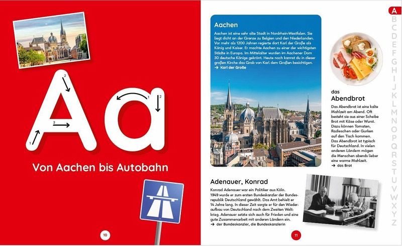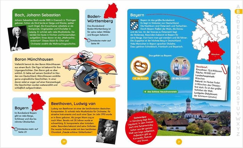 Dieses hier ist tatsächlich ein Nachschlagewerk für Kinder ab ca. 5 Jahren. Und zwar haben wir hier eine Wissensreise von A-Z durch Deutschland. Da ich drei Kinder habe, von denen zwei schon in die Schule gehen und sehr neugierig sind, bin ich sehr froh, wenn ich bei manchen Fragen ein Nachschlagewerk zu Rate ziehen kann. Außerdem finde ich es für Kinder auch immer schöner, wenn sie ein Buch in der Hand haben und man nicht alles am Handy oder am PC nachschaut.