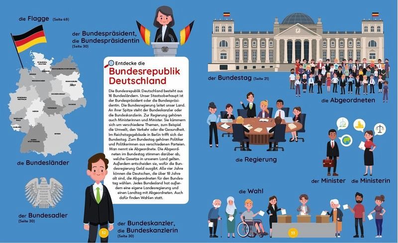 Ich bin ganz begeistert von diesem Nachschlagewerk. Es deckt so viele schöne Themen ab. Ob Mülltrennung, Haustiere, das Harz, die Energiewende oder die Schulpflicht. Man findet wirklich Informationen zu jedem erdenklichen Thema, das Deutschland betrifft. Und das finde ich große Klasse. So können neugierige Kinder einfach in dem Buch blättern und ganz nebenbei etwas über unser Land lernen. Und auch wir Eltern können das Buch total gut nutzen, wenn es eine Frage gibt und man auf der Suche nach einer kindgerechten Antwort ist. Denn hier sind die Themen wirklich richtig gut zusammengefasst.