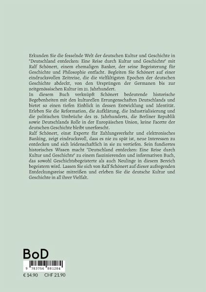 Erkunden Sie die fesselnde Welt der deutschen Kultur und Geschichte in "Deutschland entdecken: Eine Reise durch Kultur und Geschichte" mit Ralf Schönert, einem ehemaligen Banker, der seine Begeisterung für Geschichte und Philosophie entfacht. Begleiten Sie Schönert auf einer eindrucksvollen Zeitreise, die die vielfältigsten Epochen der deutschen Geschichte abdeckt, von den Ursprüngen der Germanen bis zur zeitgenössischen Kultur im 21. Jahrhundert.In diesem Buch verknüpft Schönert bedeutende historische Begebenheiten mit den kulturellen Errungenschaften Deutschlands und bietet so einen tiefen Einblick in dessen Entwicklung und Identität. Erleben Sie die Reformation, die Aufklärung, die Industrialisierung und die politischen Umbrüche des 19. Jahrhunderts, die Berliner Republik sowie Deutschlands Rolle in der Europäischen Union, keine Facette der deutschen Geschichte bleibt unerforscht.Ralf Schönert, einst Experte für Zahlungsverkehr und elektronisches Banking, zeigt eindrucksvoll, dass es nie zu spät ist, neue Interessen zu entdecken und sich leidenschaftlich in sie zu vertiefen. Sein fundiertes historisches Wissen macht "Deutschland entdecken: Eine Reise durch Kultur und Geschichte" zu einem faszinierenden und informativen Buch, das sowohl Geschichtsbegeisterte als auch Neulinge in diesem Bereich begeistern wird. Lassen Sie sich von Ralf Schönert auf dieser aufregenden Entdeckungsreise mitreißen und erleben Sie die deutsche Kultur und Geschichte in all ihrer Vielfalt.