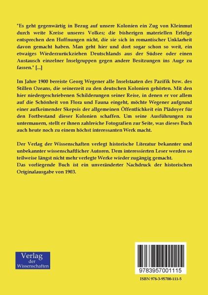 Im Jahre 1900 bereiste Georg Wegener alle Inselstaaten des Pazifik bzw. des Stillen Ozeans, die seinerzeit zu den deutschen Kolonien gehörten. Mit den hier niedergeschriebenen Schilderungen seiner Reise, in denen er vor allem auf die Schönheit von Flora und Fauna eingeht, möchte Wegener aufgrund einer aufkeimender Skepsis der allgemeinen Öffentlichkeit ein Plädoyer für den Fortbestand dieser Kolonien schaffen. Um seine Ausführungen zu untermauern, stellt er ihnen zahlreiche Fotografien zur Seite, was dieses Buch auch heute noch zu einem höchst interessanten Werk macht.
