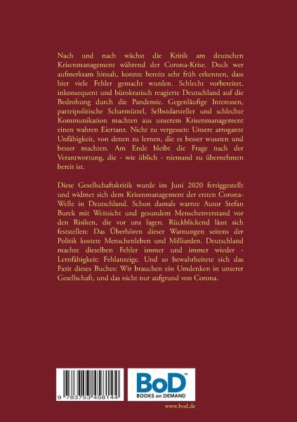 Langsam, fahrlässig, arrogant und inkompetent: Die im Juni 2020 erschienene Polit- und Gesellschaftskritik von Stefan Burek fällt ein klares Urteil über das deutsche Krisenmanagement während der ersten Corona-Welle. "Deutschland in der Corona-Krise: Corona Helau!" hält der deutschen Gesellschaft einen Spiegel vor - kurzweilig, unterhaltsam und mit einer guten Portion schwarzen Humors.Eine Pflichtlektüre auf der Suche nach der Verantwortung.In erster Auflage erschienen im Juni 2020.