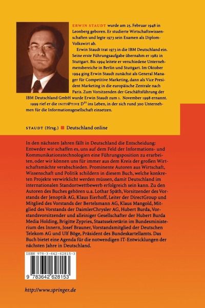 Prominente Autoren aus Wirtschaft, Wissenschaft und Politik schildern in diesem Buch, welche konkreten Projekte verwirklicht werden müssen, damit Deutschland in den nächsten Jahren eine Spitzenposition im Wettbewerb einnehmen kann und sich nicht mit einem Absteigerplatz zufriedengeben muss. Zu den Autoren des Buches gehören Lothar Späth, Vorsitzender des Vorstands der JENOPTIK AG, Klaus Eierhoff, Leiter der DirectGroup und Mitglied des Vorstands der Bertelsmann AG, Klaus Mangold, Mitglied des Vorstands DaimlerChrysler AG, Hubert Burda, Vorstandsvorsitzender und alleiniger Gesellschafter der Hubert Burda Media Holding, Brigitte Zypries, Staatssekretärin im Bundesministerium des Innern, Josef Brauner, Vorstandsmitglied der Deutschen Telekom AG und Ulf Böge, Präsident des Bundeskartellamts. Das Buch bietet eine Agenda für die notwendigen IT-Entwicklungen der nächsten Jahre in Deutschland.