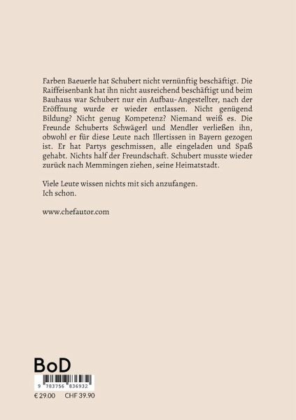 Farben Baeuerle hat Schubert nicht vernünftig beschäftigt. Die Raiffeisenbank hat ihn nicht ausreichend beschäftigt und beim Bauhaus war Schubert nur ein Aufbau-Angestellter, nach der Eröffnung wurde er wieder entlassen. Nicht genügend Bildung? Nicht genug Kompetenz? Niemand weiß es. Die Freunde Schuberts Schwägerl und Mendler verließen ihn, obwohl er für diese Leuchten nach Illertissen in Bayern gezogen ist. Er hat Partys geschmissen, alle eingeladen und Spaß gehabt. Nichts half der Freundschaft. Schubert musste wieder zurück nach Memmingen ziehen, seine Heimatstadt.
