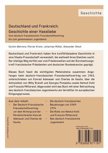 Fachbuch aus dem Jahr 2014 im Fachbereich Geschichte Europa - and. Länder - Neueste Geschichte, Europäische Einigung, , Sprache: Deutsch, Abstract: Deutschland und Frankreich haben ihre konfliktbeladene Geschichte in eine Staats-Freundschaft verwandelt, die weltweit ihres Gleichen sucht. Der steinige Weg dorthin war vom Friedenswillen und der Durchsetzungskraft französischer Präsidenten und deutscher Bundeskanzler geprägt.Dieses Buch fasst die wichtigsten Meilensteine zusammen: Angefangen beim deutsch-französischen Freundschaftsvertrag von 1963, unterschrieben von Konrad Adenauer und Charles de Gaulle, über die Amtszeiten von Willy Brandt und Georges Pompidou sowie Helmut Kohl und François Mitterand. Abgerundet wird das Buch mit einer Betrachtung des deutsch-französischen Jugendwerks als Vermittler im europäischen Einigungsprozess.Aus dem Inhalt: Der Deutsch-Französische Freundschaftsvertrag vor dem Hintergrund der Persönlichkeiten Konrad Adenauer und Charles de GaulleDie deutsch-französischen Beziehungen von 1969-1974Die Rolle von Helmut Kohl und François MitterrandDas deutsch-französische Jugendwerk