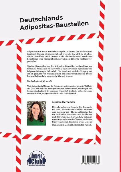 Adipositas: Ein Buch mit sieben Siegeln. Während die Stoffwechselkrankheit bislang nicht ausreichend erforscht ist, wird sie als chronische Krankheit noch immer nicht flächendeckend anerkannt. Betroffenen wird häufig fälschlicherweise ein Lifestyle-Problem vorgeworfen. Myriam Hernandez hat die Adipositas-Baustellen recherchiert, um hinter die Kulissen zu blicken: Statt Ursachen werden Symptome und Folgeerscheinungen behandelt. Die Krankheit und der Umgang mit ihr ist gesäumt von Wissenslücken und Missverständnissen. Dieses Buch soll einen Beitrag zu mehr Klarheit leisten.