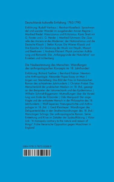 Deutschlands kulturelle Entfaltung 1763-1790 Einführung: Rudolf Vierhaus Reinhart Koselleck: Sprachwandel und sozialer Wandel im ausgehenden Ancien Regime Manfred Riedel: Historizismus und Kritizismus: Kants Streit mit G. Forster und J. G. Herder Manfred Fuhrmann: Die ,Querelle des Anciens et des Modernes¿, der Nationalismus und die Deutsche Klassik Stefan Kunze: Die Wiener Klassik und ihre Epoche: Zur Situierung der Musik von Haydn, Mozart und Beethoven Andreas Kleinert: Physik zwischen Aufklärung und Romantik: Die ¿Anfangsgründe der Naturlehre¿ von Erxleben und Lichtenberg Die Neubestimmung des Menschen: Wandlungen des anthropologischen Konzepts im 18. Jahrhundert Einführung: Richard Toellner Bernhard Fabian: Newtonische Anthropologie: Alexander Popes Essay on Man Jürgen von Stackelberg: Das Bild der Frau im französischen Roman des achtzehnten Jahrhunderts Christian Probst: Das Menschenbild der praktischen Medizin im 18. Jhd., gezeigt an den Beispielen der latromechanik und des Epidemismus Wilhelm Schmidt-Biggemann: Mutmaßungen über die Vorstellung vom Ende der Erbsünde Odo Marquard: Der angeklagte und der entlastete Mensch in der Philosophie des 18. Jahrhunderts Wolf Lepenies: Naturgeschichte und Anthropologie im 18. Jhd. Gerd Kleinheyer: Wandlungen des Deliquentenbildes in den Strafrechtsordnungen des 18. Jhd. Hans-Jürgen Schings: Der anthropologische Roman. Seine Entstehung und Krise im Zeitalter der Spätaufklärung Victor Link: ¿A monopoly contrary to the nature and reason of things¿: Frühe literarische Opposition gegen Maschinen in England