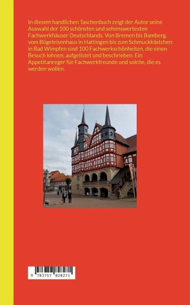 In diesem handlichen Taschenbuch zeigt der Autor seine Auswahl der 100 schönsten und sehenswertesten Fachwerkhäuser Deutschlands. Von Bremen bis Bamberg, vom Spitzhäuschen in Bernkastel-Kues bis zum Schmuckkästchen in Bad Wimpfen sind 100 Fachwerkschönheiten, die einen Besuch lohnen, aufgelistet und beschrieben. Ein Appetitanreger für Fachwerkfreunde und solche, die es werden wollen.