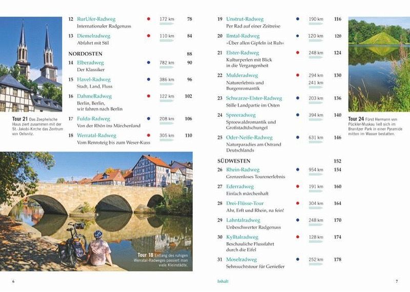 Wohin soll die nächste Radreise gehen? Welche schönen Flüsse gibt es zu entdecken? "Deutschlands schönste Flussradwege" beantwortet all diese Fragen. Das Buch präsentiert die Vielfalt des Radwegenetzes Deutschlands und beinhaltet neben den "Klassikern" auch den ein oder anderen Geheimtipp. Jeder der 50 Wege wird auf reich bebilderten Seiten beschrieben: Kurzinfos, Höhenprofil, Streckenführung, Highlights und Tipps. Mit einer kompletten Übersichtskarte aller Touren ist die optimale Vorbereitung Ihrer nächsten Radreise gewährleistet.