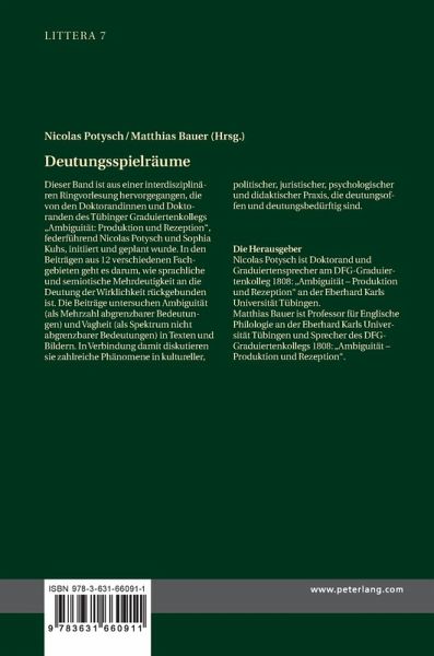 Dieser Band ist aus einer interdisziplinären Ringvorlesung hervorgegangen, die von den Doktorandinnen und Doktoranden des Tübinger Graduiertenkollegs "Ambiguität: Produktion und Rezeption", federführend Nicolas Potysch und Sophia Kuhs, initiiert und geplant wurde. In den Beiträgen aus 12 verschiedenen Fachgebieten geht es darum, wie sprachliche und semiotische Mehrdeutigkeit an die Deutung der Wirklichkeit rückgebunden ist. Die Beiträge untersuchen Ambiguität (als Mehrzahl abgrenzbarer Bedeutungen) und Vagheit (als Spektrum nicht abgrenzbarer Bedeutungen) in Texten und Bildern. In Verbindung damit diskutieren sie zahlreiche Phänomene in kultureller, politischer, juristischer, psychologischer und didaktischer Praxis, die deutungsoffen und deutungsbedürftig sind.