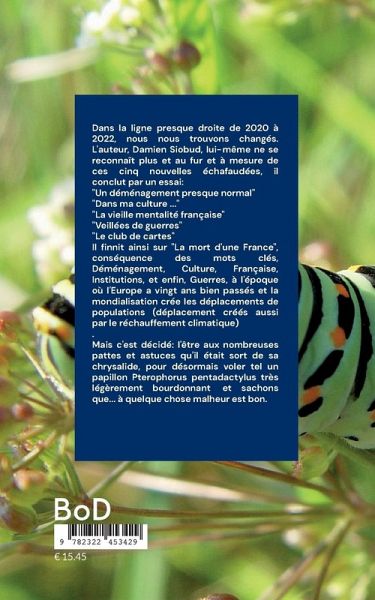 Dans la ligne presque droite de 2020 à 2022, nous nous trouvons changés. L'auteur, Damien Siobud, lui-même ne se reconnaît plus et au fur et à mesure de ces cinq nouvelles échafaudées, il conclut par un essai."Un déménagement presque normal""Dans ma culture ...""La vieille mentalité française""Veillées de guerres""Le club de cartes"il finit sur "La mort d'une France", conséquence des mots clés, Déménagement, Culture, Française, Institutions, et enfin, Guerres - à l'époque où l'Europe a vingt-et-un ans et la mondialisation crée les déplacements de populations (et les migrations climatiques).Mais c'est décidé: l'être aux nombreuses pattes et astuces qu'il était sort de sa chrysalide, pour désormais voler tel un papillon Pterophorus pentadactylus très légèrement bourdonnant ... et ... à quelque chose malheur est bon.