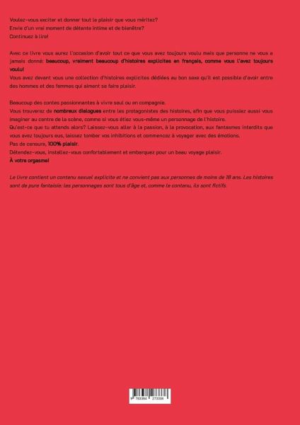 Voulez-vous exciter et donner tout le plaisir que vous méritez?Envie d'un vrai moment de détente intime et de bienêtre?Continuez à lire!Avec ce livre vous aurez l'occasion d'avoir tout ce que vous avez toujours voulu mais que personne ne vous a jamais donné: beaucoup, vraiment beaucoup d'histoires explicites en français, comme vous l'avez toujours voulu!Vous avez devant vous une collection d'histoires explicites dédiées au bon sexe qu'il est possible d'avoir entre des hommes et des femmes qui aiment se faire plaisir. Beaucoup des contes passionnantes à vivre seul ou en compagnie.Vous trouverez de nombreux dialogues entre les protagonistes des histoires, afin que vous puissiez aussi vous imaginer au centre de la scène, comme si vous étiez vous-même un personnage de l'histoire.Qu'est-ce que tu attends alors? Laissez-vous aller à la passion, à la provocation, aux fantasmes interdits que vous avez toujours eus, laissez tomber vos inhibitions et commencez à voyager avec des émotions.Pas de censure, 100 pour 100 de plaisir.Détendez-vous, installez-vous confortablement et embarquez pour un beau voyage plaisir.À votre orgasme!