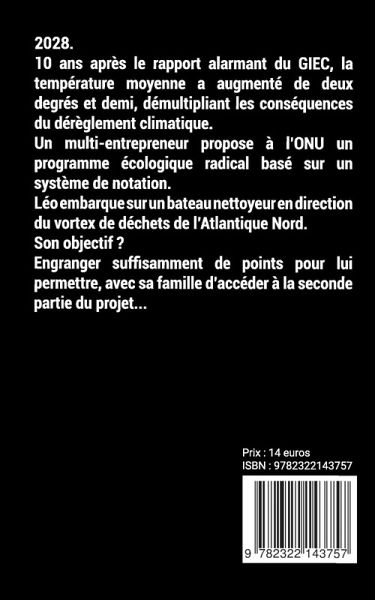 2028. 10 ans après le rapport alarmant du GIEC, la température moyenne a augmenté de deux degrés et demi, démultipliant les conséquences du dérèglement climatique. Un multi-entrepreneur propose à l'ONU un programme écologique radical basé sur un système de notation. Léo embarque sur un bateau nettoyeur en direction du vortex de déchets de l'Atlantique Nord. Son objectif ? Engranger suffisamment de points pour lui permettre, avec sa famille d'accéder à la seconde partie du projet...