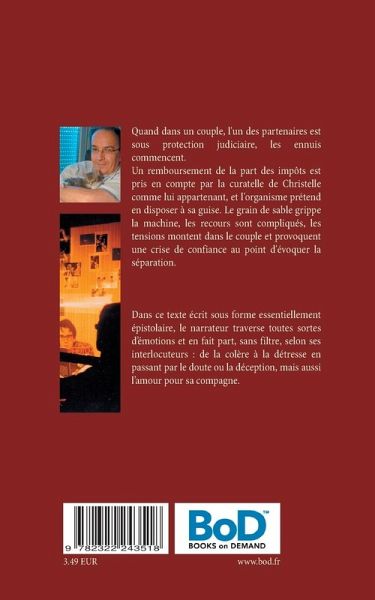 Quand dans un couple, l'un des partenaires est sous protection judiciaire, les ennuis commencent.Un remboursement de la part des impôts est pris en compte par la curatelle de Christelle comme lui appartenant, et l'organisme prétend en disposer à sa guise. Le grain de sable grippe la machine, les recours sont compliqués, les tensions montent dans le couple et provoquent une crise de confiance au point d'évoquer la séparation.Dans ce texte écrit essentiellement sous la forme épistolaire, le narrateur traverse toutes sortes d'émotions et en fait part, sans filtre, selon ses interlocuteurs: de la colère à la détresse, en passant par le doute et la déception, mais aussi l'amour pour sa compagne.