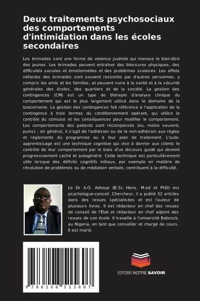 Les brimades sont une forme de violence juvénile qui menace le bien-être des jeunes. Les brimades peuvent entraîner des blessures physiques, des difficultés sociales et émotionnelles et des problèmes scolaires. Les effets néfastes des brimades sont souvent ressentis par d'autres personnes, y compris les amis et les familles, et peuvent nuire à la santé et à la sécurité générales des écoles, des quartiers et de la société. La gestion des contingences (CM) est un type de thérapie d'analyse clinique du comportement qui est le plus largement utilisé dans le domaine de la toxicomanie. La gestion des contingences fait référence à l'application de la contingence à trois termes du conditionnement opérant, qui utilise le contrôle du stimulus et les conséquences pour modifier le comportement. Les comportements des patients sont récompensés (ou, moins souvent, punis) ; en général, il s'agit de l'adhésion ou de la non-adhésion aux règles et règlements du programme ou à leur plan de traitement. L'auto-apprentissage est une technique cognitive qui vise à donner aux clients le contrôle de leur comportement par le biais d'un discours guidé qui devient progressivement caché et autogénéré. Cette technique est particulièrement utile lorsque des déficits cognitifs initiaux, par exemple en matière de résolution de problèmes ou de médiation verbale, contribuent à la difficulté.
