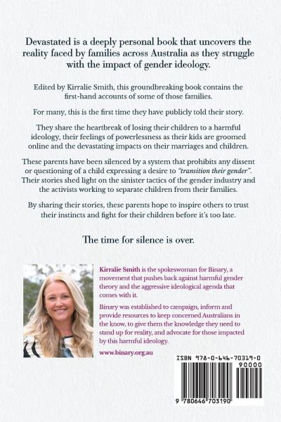 Devastated is a deeply personal book that uncovers the reality faced by families across Australia as they struggle with the impact of gender ideology. Edited by Kirralie Smith, this groundbreaking book contains the first-hand accounts of some of those families. For many, this is the first time they have publicly told their story. They share the heartbreak of losing their children to a harmful ideology, their feelings of powerlessness as their kids are groomed online and the devastating impacts on their marriages and children. These parents have been silenced by a system that prohibits any dissent or questioning of a child expressing a desire to "transition their gender". Their stories shed light on the sinister tactics of the gender industry and the activists working to separate children from their families. By sharing their stories, these parents hope to inspire others to trust their instincts and fight for their children before it's too late.