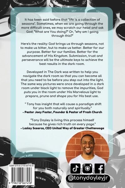 It has been said before that "life is a collection of seasons". Sometimes, when we are going through the more difficult ones, we may scratch our head and ask God, "What are You doing?" Or, "why am I going through this?" Here's the reality: God brings us through seasons, not to make us bitter, but to make us better. Better for our purpose. Better for our families. Better for the advancement of His Kingdom. Submission, trust and perseverance will be the ultimate keys to achieve the best results in the dark room. Developed in The Dark was written to help you navigate the dark room so that you can become all that you need to be before you step out into the light. The same way pictures were once developed in a dark room under black light to remove the impurities, God puts you in the room under His Marvelous light to prepare, prune and shape you for His best use.
