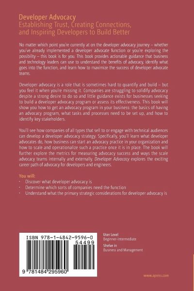 No matter which point you're currently at on the developer advocacy journey - whether you've already implemented a developer advocate function or you're exploring the possibility - this book is for you. This book provides actionable guidance that business and technology leaders can use to understand the benefits of advocacy, identify what goes into the function, and learn how to maximize the success of developer advocate teams.