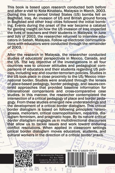 This book is based upon research conducted both before and after a visit to Kota Kinabalu, Malaysia in March, 2003. During this time period United States (US) bombs fell on Baghdad, Iraq. An invasion of US and British ground forces in Baghdad and other Iraqi cities followed the initial bombing. Events during the onset of the war became a catalyst for gaining insight on how the US invasion of Iraq impacted the lives of teachers and their students in Malaysia. In June and July of 2003, the researcher returned to interview educators in Sabah, Malaysia. Follow-up electronic communications with educators were conducted through the remainder of 2003. After the research in Malaysia, the researcher conducted studies of educators' perspectives in Mexico, Canada, and the US. The key objective of the investigations in all four countries was to uncover attitudes and pedagogical comparisons of educators and their students regarding US policies, including war and counter-terrorism policies. Studies in the US took place in close proximity to the US/Mexico international border. Studies were analyzed through the lenses of place-based pedagogy, border pedagogy, and issues-centered approaches that provided baseline information for transnational comparisons and cross-comparative case studies. In this manner, the researcher contemplated the intersection of a critical pedagogy of place and border pedagogy. From these studies emerged new understandings and the development of a critical border dialogism . This critical border dialogism is based on following principles: heteroglossia, meliorism, critical cosmopolitanism, nepantla, dialogism feminism, and pragmatic hope. By its nature critical border dialogism engages us in multidirectional discourses that allow us to tackle issues and work toward enduring conflict resolutions. When applied in classroom settings critical border dialogism moves educators, students, and cultural workers in the direction of a critical border praxis.
