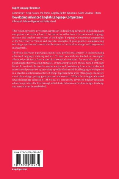 Foreword; Vivian Cook.- Introduction; Armin Berger.- Part I The English Language Competence Programme at the University of Vienna.- Language Analysis / Grammar in Use; Helen Heaney & Gunther Kaltenböck.- Integrated Language and Study Skills; Galina Savukova & Thomas Martinek.- Language in Use; Gillian Schwarz-Peaker.- English in a Professional Context; Amy Bruno-Lindner.- English for Academic Purposes; Angelika Rieder-Bünemann.- Mediation and Genre Analysis for English Teachers; Gabrielle Smith.- Practical Phonetics and Oral Communication Skills; Karin Richter.- The Language Lab; Maria Milchram, Magdalena Schwarz & Olivia Wankmüller.- Advanced Speaking Skills for English Teachers; Karin Richter.- The Vienna English Language Test; Susanne Sweeney-Novak.- The Common Final Test; Thomas Martinek.- Part II Teaching English to Advanced Learners.- Written Reception and Production.- Writing an Argumentative Essay Like Sherlock Holmes: Teaching Essay Structure with the Detective Analogy; Horst Prillinger.- Teaching Deep Competence in Academic Writing; Gabrielle Smith.- Discerning Implicit Meaning and Signalling Writer Stance; Galina Savukova.- Teaching Punctuation in Consecutive Courses; Galina Savukova.- Yes/No/Not Given? An Integrative Approach to Teaching Academic Reading and Writing Skills; Thomas Martinek.- Spoken Production and Interaction.- Dealing with Stage Fright; Karin Richter.- Improving Advanced Interaction Skills; Amy Bruno-Lindner, Karin Richter, Galina Savukova.- New Ideas for Teaching Speaking: Speech Days; Brigitte Roth & Elisabeth Weitz-Polydoros.- Raising Awareness of the Role of Intonation; Meta Gartner-Schwarz.- Text Analysis and Mediation.- Reading Below the Surface: Guiding Students to Getting More out of Texts; Lisa Nazarenko.- Improving Students' Writing Skills in English in a Professional Context; Amy Bruno-Lindner.- Text Transformation: The Art of Parody; Elisabeth Müller-Lipold.- Part III Teacher Research on Learning, Teaching and Assessment.- Students' Conceptions of Academic Writing in a Second Language: Perspectives of Advanced Students of English; Angelika Rieder-Bünemann & Pia Resnik.- Analysing Discourse Coherence in Students' L2 Writing: Rhetorical Structure and the Use of Connectives; Barbara Schiftner.- The Role of Identity in the Adult EFL Pronunciation Classroom; Karin Richter.- Attitudes Towards Vocabulary Learning When Using a Vocabulary Log; Helen Heaney & Sandra Pelzmann.- Weaving Academic Texts: An Observation of Students' Quest for the Magic of Words in the Language Competence Program; Katharina Ghamarian.- The Challenges of Improving Vocabulary Depth and Breadth at an Advanced Level: A Survey of the Literature; Helen Heaney & Gillian Schwarz-Peaker.- Developing Benchmarks for Rater Training as well as Teaching and Learning Purposes; Armin Berger.- Assessing Oral Presentations and Interactions: From a 'Systematic' to a 'Salient Features' Approach; Armin Berger.- Conclusion; Armin Berger.