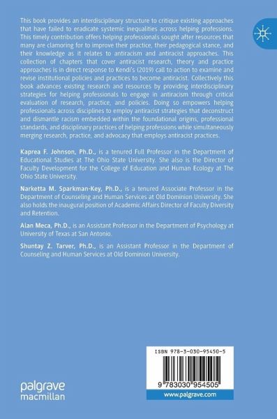 This book provides an interdisciplinary structure to critique existing approaches that have failed to eradicate systemic inequalities across helping professions. This timely contribution offers helping professionals sought after resources that many are clamoring for to improve their practice, their pedagogical stance, and their knowledge as it relates to antiracism and antiracist approaches. This collection of chapters that cover antiracist research, theory and practice approaches is in direct response to Kendi's (2019) call to action to examine and revise institutional policies and practices to become antiracist. Collectively this book advances existing research and resources by providing interdisciplinary strategies for helping professionals to engage in antiracism through critical evaluation of research, practice, and policies. Doing so empowers helping professionals across disciplines to employ antiracist strategies that deconstruct and dismantle racism embedded within the foundational origins, professional standards, and disciplinary practices of helping professions while simultaneously merging research, practice, and advocacy that employs antiracist practices.