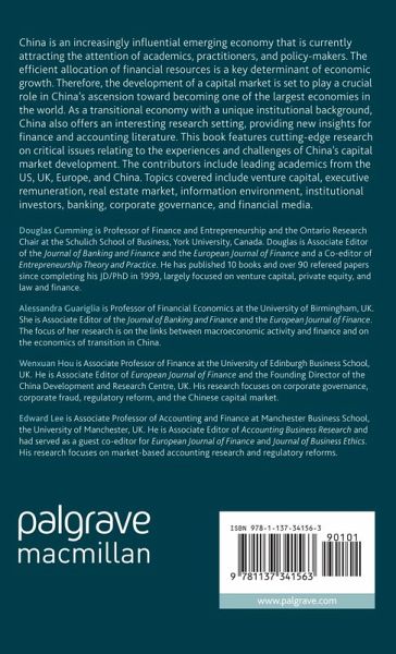 1. Introduction to the Experiences and Challenges in the Development of the Chinese Capital Market; Douglas Cumming, Alessandra Guariglia, Wenxuan Hou and Edward Lee 2. Information Asymmetry and the Diversification Discount: Evidence from listed firms in China; Michael Firth, Man Jin and Yuanyuan Zhang 3. Asset Pricing under Financial Repression: Evidence from the Chinese Real Estate Boom during 1999-2010; Xiuping Hua and Chris Adcock 4. Venture Capital Investments in China: Reputation, Syndication, and Valuation; Sheng Xiao and Xiangyi Zhou 5. Growth and Challenges in the Development of Institutional Investors in China; Liming Wang, Ningyue Liu and ShuoWang 6. Impact of Foreign Bank Entry on the Performance of Chinese Banks; Yizhe Dong, Alessandra Guariglia and Wenxuan Hou 7. Chinese Executive Compensation: Where Do We Stand?; Martin Conyon and Lerong He 8. Independent Directors and Corporate Performance in China; Hanzhang Jiao, Yizhe Dong, Wenxuan Hou and Edward Lee
