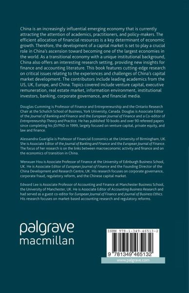 1. Introduction to the Experiences and Challenges in the Development of the Chinese Capital Market; Douglas Cumming, Alessandra Guariglia, Wenxuan Hou and Edward Lee 2. Information Asymmetry and the Diversification Discount: Evidence from listed firms in China; Michael Firth, Man Jin and Yuanyuan Zhang 3. Asset Pricing under Financial Repression: Evidence from the Chinese Real Estate Boom during 1999-2010; Xiuping Hua and Chris Adcock 4. Venture Capital Investments in China: Reputation, Syndication, and Valuation; Sheng Xiao and Xiangyi Zhou 5. Growth and Challenges in the Development of Institutional Investors in China; Liming Wang, Ningyue Liu and ShuoWang 6. Impact of Foreign Bank Entry on the Performance of Chinese Banks; Yizhe Dong, Alessandra Guariglia and Wenxuan Hou 7. Chinese Executive Compensation: Where Do We Stand?; Martin Conyon and Lerong He 8. Independent Directors and Corporate Performance in China; Hanzhang Jiao, Yizhe Dong, Wenxuan Hou and Edward Lee
