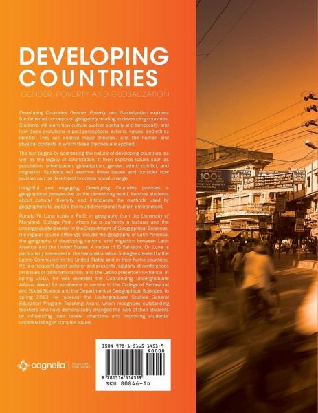 Developing Countries: Gender, Poverty, and Globalization explores fundamental concepts of geography relating to developing countries. Students will learn how culture evolves spatially and temporally, and how these evolutions impact perceptions, actions, values, and ethnic identity. They will analyze major theories, and the human and physical contexts in which these theories are applied. The text begins by addressing the nature of developing countries, as well as the legacy of colonization. It then explores issues such as population, urbanization, globalization, gender, ethnic conflict, and migration. Students will examine these issues and consider how policies can be developed to create social change. Insightful and engaging, Developing Countries provides a geographical perspective on the developing world, teaches students about cultural diversity, and introduces the methods used by geographers to explore the multidimensional human environment. Ronald W. Luna holds a Ph.D. in geography from the University of Maryland, College Park, where he is currently a lecturer and the undergraduate director in the Department of Geographical Sciences. His regular course offerings include the geography of Latin America, the geography of developing nations, and migration between Latin America and the United States. A native of El Salvador, Dr. Luna is particularly interested in the transnationalism linkages created by the Latino Community in the United States and in their home countries. He is a frequent guest lecturer and presents regularly at conferences on issues of transnationalism, and the Latino presence in America. In spring 2010, he was awarded the Outstanding Undergraduate Advisor Award for excellence in service to the College of Behavioral and Social Science and the Department of Geographical Sciences. In spring 2013, he received the Undergraduate Studies General Education Program Teaching Award, which recognizes outstanding teachers who have demonstrably changed the lives of their students by influencing their career directions and improving students' understanding of complex issues.