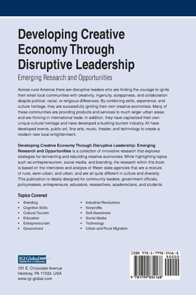 Across rural America there are disruptive leaders who are finding the courage to ignite their small local communities with creativity, ingenuity, scrappiness, and collaboration despite political, racial, or religious differences. By combining skills, experience, and culture heritage, they are successfully igniting their own creative economies. Many of these communities are providing products and services to much larger urban areas and are thriving in international trade. In addition, they have capitalized their own unique cultural heritage and have developed a bustling tourism industry. All have developed events, public art, fine arts, music, theater, and technology to create a modern new local enlightenment. Developing Creative Economy Through Disruptive Leadership: Emerging Research and Opportunities is a collection of innovative research that explores strategies for reinventing and rebuilding creative economies. While highlighting topics such as entrepreneurism, social media, and branding, the research within this book is based on the interviews and analysis of fifteen state agencies that are a mixture of rural, semi-urban, and urban, and are all quite different in culture and diversity. This publication is ideally designed for community leaders, government officials, policymakers, entrepreneurs, educators, researchers, academicians, and students.