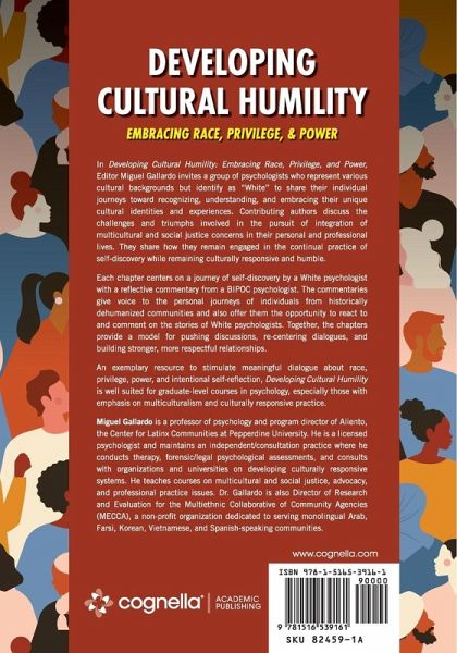 In Developing Cultural Humility: Embracing Race, Privilege, and Power, Editor Miguel Gallardo invites a group of psychologists who represent various cultural backgrounds but identify as "White" to share their individual journeys toward recognizing, understanding, and embracing their unique cultural identities and experiences. Contributing authors discuss the challenges and triumphs involved in the pursuit of integration of multicultural and social justice concerns in their personal and professional lives. They share how they remain engaged in the continual practice of self-discovery while remaining culturally responsive and humble. Each chapter centers on a journey of self-discovery by a White psychologist with a reflective commentary from a BIPOC psychologist. The commentaries give voice to the personal journeys of individuals from historically dehumanized communities and also offer them the opportunity to react to and comment on the stories of White psychologists. Together, the chapters provide a model for pushing discussions, re-centering dialogues, and building stronger, more respectful relationships. An exemplary resource to stimulate meaningful dialogue about race, privilege, power, and intentional self-reflection, Developing Cultural Humility is well suited for graduate-level courses in psychology, especially those with emphasis on multiculturalism and culturally responsive practice.