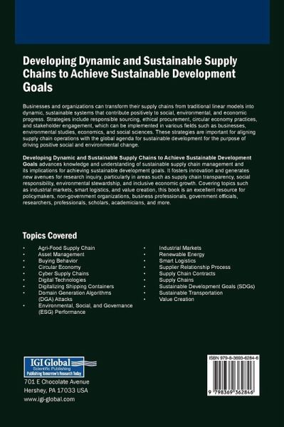 Businesses and organizations can transform their supply chains from traditional linear models into dynamic, sustainable systems that contribute positively to social, environmental, and economic progress. Strategies include responsible sourcing, ethical procurement, circular economy practices, and stakeholder engagement, which can be implemented in various fields such as businesses, environmental studies, economics, and social sciences. These strategies are important for aligning supply chain operations with the global agenda for sustainable development for the purpose of driving positive social and environmental change. Developing Dynamic and Sustainable Supply Chains to Achieve Sustainable Development Goals advances knowledge and understanding of sustainable supply chain management and its implications for achieving sustainable development goals. It fosters innovation and generates new avenues for research inquiry, particularly in areas such as supply chain transparency, social responsibility, environmental stewardship, and inclusive economic growth. Covering topics such as industrial markets, smart logistics, and value creation, this book is an excellent resource for policymakers, non-government organizations, business professionals, government officials, researchers, professionals, scholars, academicians, and more.