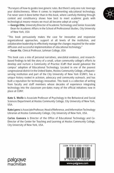 This book uses a mix of personal narratives, anecdotal evidence, and research-based findings to tell the story of a small, urban community college's efforts to develop and nurture a Community of Practice (CoP) that would galvanize the campus' adoption of Educational Technology. Located in one of the poorest congressional district in the United States, Hostos Community College, a Hispanic-serving institution and part of the City University of New York (CUNY), has a unique history rooted in activism, advocacy, and community outreach, and has built a reputation for technology innovation. This book is a collection of writing from faculty and staff members whose decades of experience integrating technology into the classroom pre-dates many of the official initiatives now in place at CUNY.