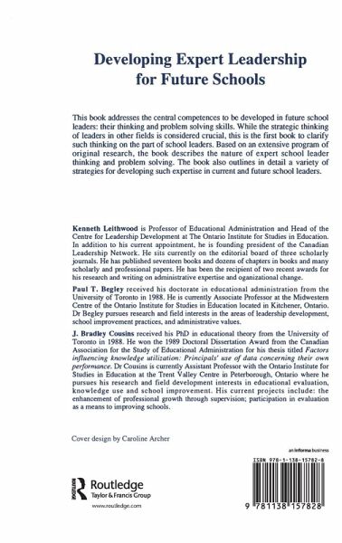 Part 1 A perspective on developing expert leadership for future schools: a conception of expert leadership for future schools; what research tells us about the present state of schools leadership. Part 2 The nature of expert leadership for future schools: envisioning the future schools; expert school leadership on the high ground and in the swamp; expert leadership on the high ground; expert leadership in the swamp; the special role of values in school leadership; teacher development - a central problem for leaders of future schools; collaborative school cultures - a key part of the solution. Part 3 Developing expert leadership for future schools: the socialization of school-leaders; characteristics of formal programs for developing leadership on the high ground; characteristics of formal programmes for developing expert school leadership in the swamp; performance appraisal and selection of school leaders - performance appraisal for growth; performance appraisal and selection of school leaders - selection processes and measurement issues; implications for district leaders.