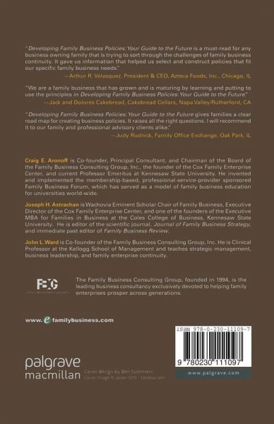 'Developing Family Business Policies: Your Guide to the Future is a must-read for any business owning family that is trying to sort through the challenges of family business continuity. It gave us information that helped us select and construct policies that fit our speicific family business needs.' - Arthur R. Velasquez, President & CEO, Azteca Foods, Inc., Chicago, IL