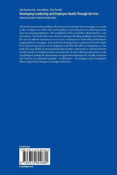 This book examines the problems that a "laissez faire" attitude from managers can create in the workplace, as well as the ensuing illness such problems may cause among employees. The book offers new ideas for dealing with these problems and proposes the use of cultural experiences as an active component in leadership development programmes for managers. It presents the findings from a randomized trial to show how cultural experiences can be deployed, and what the effect on employees is. The book discusses health-promoting leadership and key components in cultural activities for the benefit of workplaces from several points of view, offering a historical, social, psychological, biological, educational and organizational perspective. Finally, it presents new theories on empathy in managers, and on employee effects of good/bad changes in manager behaviour.