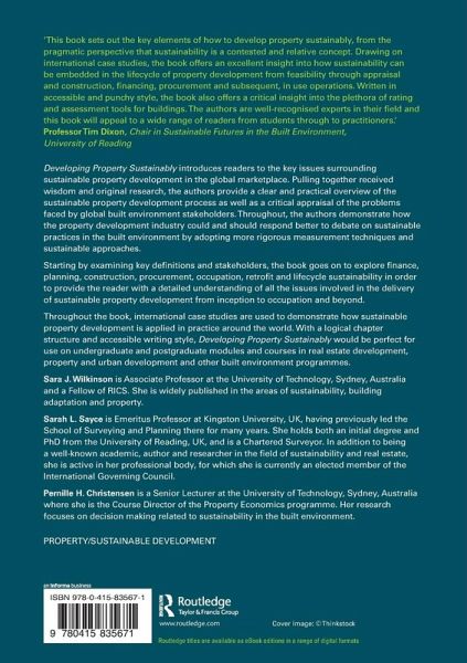 Developing Property Sustainably introduces readers to the key issues surrounding sustainable property development in the global marketplace. Pulling together received wisdom and original research, the authors provide a clear and practical overview of the sustainable property development process as well as a critical appraisal of the problems faced by global built environment stakeholders. Throughout, the authors demonstrate how the property development industry could and should respond better to debate on sustainable practices in the built environment by adopting more rigorous measurement techniques and sustainable approaches. Starting by exploring key definitions and stakeholders, the book goes on to explore finance, planning, construction, procurement, occupation, retrofit and lifecycle sustainability in order to provide the reader with a detailed understanding of all the issues involved in the delivery of sustainable property development from inception to occupation and beyond. Throughout the book, international case studies are used to demonstrate how sustainable property development is applied in practice around the world. With a logical chapter structure and accessible writing style, Developing Property Sustainably would be perfect for use on undergraduate and postgraduate modules and courses in real estate development, property and urban development and other built environment programmes.