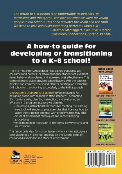 The return to K-8 schools is an opportunity to step back, be purposeful and thoughtful, and plan for what we want for young persons in our schools. This book provides the vision and the tools we need to plan and build something better in Grades K-8'- Heather MacTaggart, Executive Director, Classroom Connections, Ontario, Canada The K-8 model for school design has gained popularity with educators and parents for demonstrating higher student achievement, fewer behavioural problems, and increased cost effectiveness. This comprehensive guide provides school leaders with the tools to develop and implement a sound plan for creating an exemplary K-8 school or transitioning successfully to the K-8 approach. Developing Successful K-8 Schools offers strategies for designing curriculum aligned to state standards, promoting 21st-century skills, planning instruction, and evaluating an effective K-8 programme. Readers will also find: - Ten proven instructional methods for meeting the learning needs of K-8 students, plus examples that illustrate how to apply the strategies and deal with problems that might arise - Student assessment techniques and record-keeping procedures - Implementation tools such as checklists, activity charts, and much more. This resource is ideal for school leaders who want to articulate a clear vision for a K-8 school and stay on the cutting edge of educational excellence and student achievement.