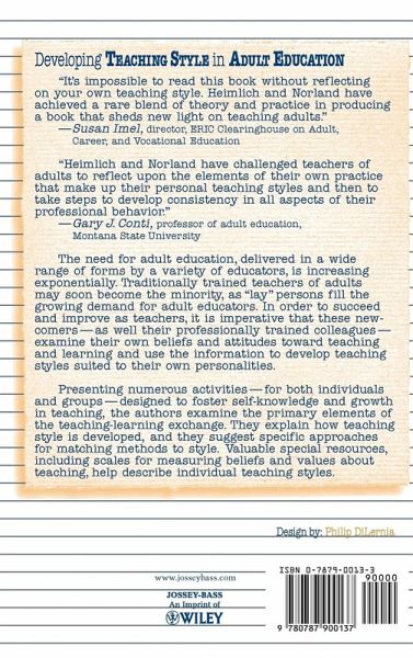 "It's impossible to read this book without reflecting on your own teaching style. Heimlich and Norland have achieveed a rare blAnd of theory and practice in producing a book that sheds new light on teaching adults." -Susan Imel, director, ERIC Clearinghouse on Adult, Career, and Vocational Education Presenting numerous activities-for both individuals and groups-designed to foster self-knowledge and growth in teaching, the authors examine the primary elements of the teaching-learning exchange. They explain how teaching style is developed, and they suggest specific approaches for matching methods to style. Valuable special resources, including scales for measuring beliefs and values about teaching, help describe individual teaching styles.