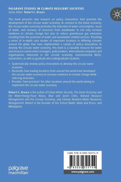 This book presents new research on policy innovations that promote the development of the circular water economy. In contrast to the linear economy, the circular water economy promotes the reduction of water consumption, reuse of water, and recovery of resources from wastewater to not only increase resilience to climate change but also to reduce greenhouse gas emissions resulting from the provision of water and wastewater-related services. Providing a series of in-depth case studies of important locations in differing climates around the globe that have implemented a variety of policy innovations to develop the circular water economy, this book is a valuable resource for water and resource conservation managers, policymakers, international companies and organisations interested in the circular economy, environmental NGOs, researchers, as well as graduate and undergraduate students.