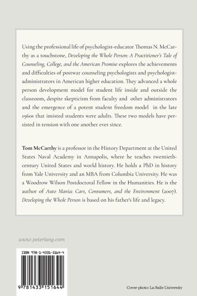 Using the professional life of psychologist-educator Thomas N. McCarthy as a touchstone, Developing the Whole Person: A Practitioner's Tale of Counseling, College, and the American Promise explores the achievements and difficulties of postwar counseling psychologists and psychologist-administrators in American higher education. They advanced a whole person development model for student life inside and outside the classroom, despite skepticism from faculty and other administrators and the emergence of a potent student freedom model in the late 1960s that insisted students were adults. These two models have persisted in tension with one another ever since.