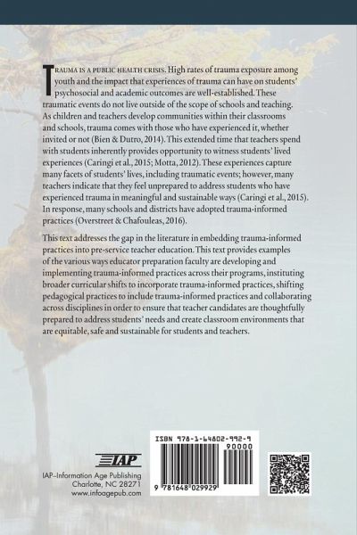 Trauma is a public health crisis. High rates of trauma exposure among youth and the impact that experiences of trauma can have on students' psychosocial and academic outcomes are well-established. These traumatic events do not live outside of the scope of schools and teaching. As children and teachers develop communities within their classrooms and schools, trauma comes with those who have experienced it, whether invited or not (Bien & Dutro, 2014). This extended time that teachers spend with students inherently provides opportunity to witness students' lived experiences (Caringi et al., 2015; Motta, 2012). These experiences capture many facets of students' lives, including traumatic events; however, many teachers indicate that they feel unprepared to address students who have experienced trauma in meaningful and sustainable ways (Caringi et al, 2015). In response, many schools and districts have adopted trauma-informed practices (Overstreet & Chafouleas, 2016). This text addresses the gap in the literature in embedding trauma-informed practices into pre-service teacher education. This text provides examples of the various ways educator preparation faculty are developing and implementing trauma-informed practices across their programs, instituting broader curricular shifts to incorporate trauma-informed practices, shifting pedagogical practices to include trauma-informed practices and collaborating across disciplines in order to ensure that teacher candidates are thoughtfully prepared to address students' needs and create classroom environments that are equitable, safe and sustainable for students and teachers.