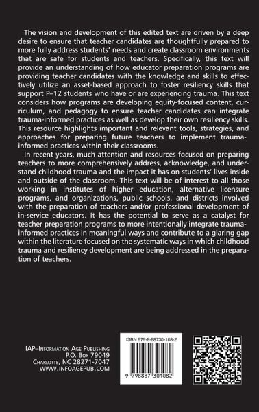 The vision and development of this edited text are driven by a deep desire to ensure that teacher candidates are thoughtfully prepared to more fully address students' needs and create classroom environments that are safe for students and teachers. Specifically, this text will provide an understanding of how educator preparation programs are providing teacher candidates with the knowledge and skills to effectively utilize an asset-based approach to foster resiliency skills that support P-12 students who have or are experiencing trauma. This text considers how programs are developing equity-focused content, curriculum, & pedagogy to ensure teacher candidates can integrate trauma-informed practices as well as develop their own resiliency skills. This resource highlights important and relevant tools, strategies, and approaches for preparing future teachers to implement trauma-informed practices within their classrooms. In recent years, much attention and resources focused on preparing teachers to more comprehensively address, acknowledge, and understand childhood trauma and the impact it has on students' lives inside and outside of the classroom. This text will be of interest to all those working in institutes of higher education, alternative licensure programs, and organizations, public schools, and districts involved with the preparation of teachers and/or professional development of in-service educators. It has the potential to serve as a catalyst for teacher preparation programs to more intentionally integrate trauma-informed practices in meaningful ways and contribute to a glaring gap within the literature focused on the systematic ways in which childhood trauma and resiliency development are being addressed in the preparation of teachers.