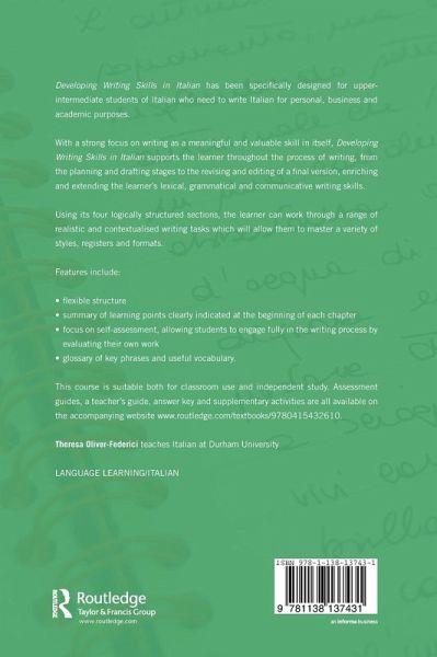 Developing Writing Skills in Italian has been devised for intermediate to advanced students of Italian who need to write Italian in the course of their leisure activities, work or study.