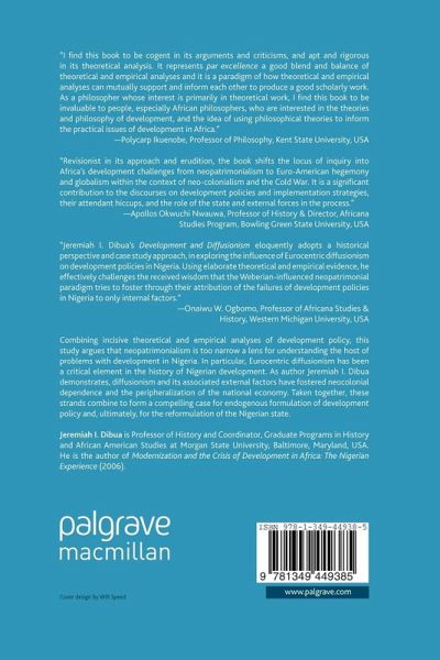 'Jeremiah I. Dibua's Development and Diffusionism eloquently adopts a historical perspective and case study approach, in exploring the influence of Eurocentric diffusionism on development policies in Nigeria. Using elaborate theoretical and empirical evidence, he effectively challenges the received wisdom that the Weberian-influenced neopatrimonial paradigm tries to foster through their attribution of the failures of development policies in Nigeria to only internal factors.' - Onaiwu W. Ogbomo, Professor of Africana Studies & History, Western Michigan University, USA