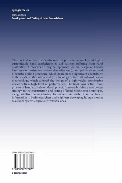This book describes the development of portable, wearable, and highly customizable hand exoskeletons to aid patients suffering from hand disabilities. It presents an original approach for the design of human hand motion assistance devices that relies on (i) an optimization-based kinematic scaling procedure, which guarantees a significant adaptability to the user's hands motion, and (ii) a topology optimization-based design methodology, which allowed the design of a lightweight, comfortable device with a high level of performance. The book covers the whole process of hand exoskeleton development, from establishing a new design strategy, to the construction and testing of hand exoskeleton prototypes, using additive manufacturing techniques. As such, it offers timely information to both researchers and engineers developing human motion assistance systems, especially wearable ones.