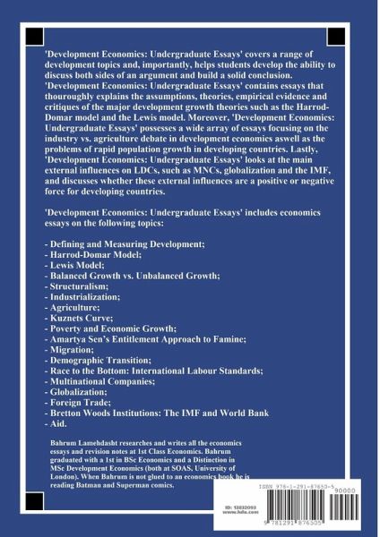 This book contains essays and revision notes for Development Economics at the undergraduate level. This book includes the following topics: - Defining and Measuring Development; - Harrod-Domar Model; - Lewis Model; - Balanced Growth vs. Unbalanced Growth; - Structuralism; - Industrialization; - Agriculture; - Kuznets Curve; - Poverty and Economic Growth; - Kalecki's Development Finance Model; - Migration; - Amartya Sen's Entitlement Approach to Famine; - Race to the Bottom: International Labour Standards; - Democracy or Dictatorship?; - Military Spending and Economic Growth; - Multinational Companies; - Globalization; - Bretton Woods Institutions: The IMF and World Bank - Aid.
