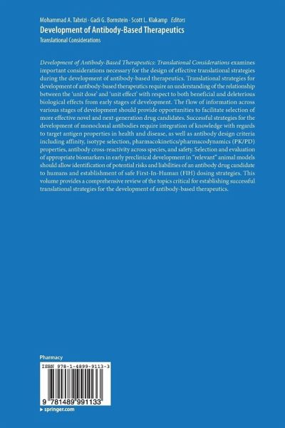 Translational strategies for development of antibody-based therapeutics should allow understanding of the relationship between the 'unit dose' and 'unit effect' with respect to both beneficial and deleterious effects from early stages of development. The flow of information from later to earlier stages of development should provide opportunities to facilitate selection of more effective novel and next-generation drug candidates. Selection and evaluation of relevant biomarkers in early preclinical development in "relevant" animal models should allow for identifying potential risks to humans and establishing safe First-In-Human (FIH) dosing strategies. Hence, integration of knowledge with respect to target antigen properties such as antigen distribution, expression profile, kinetic properties, target pharmacology, antigen isoforms and pharmacological redundancy in health and disease, as well as antibody design criteria, such as antibody isotype, affinity, PK/PD and safety is a critical necessity for the design of effective translational strategies. Additionally, these factors will further offer critical differentiating characteristics for next-generation antibodies, and novel technologies prove instrumental in generation of biosuperior antibody candidates for market entry. This book will examine many important considerations necessary for the design of effective translational strategies during the development of antibody-based therapeutics.