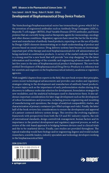 The biotechnology/biopharmaceutical sector has tremendously grown which led to the invention of engineered antibodies such as Antibody Drug Conjugates (ADCs), Bispecific T-cell engager (BITES), Dual Variable Domain (DVD) antibodies, and fusion proteins that are currently being used as therapeutic agents for immunology, oncology and other disease conditions. Regulatory agencies have raised the bar for the development and manufacture of antibody-based products, expecting to see the use of Quality by Design (QbD) elements demonstrating an in-depth understanding of product and process based on sound science. Drug delivery systems have become an increasingly important part of the therapy and most biopharmaceuticals for self-administration are being marketed as combination products. A survey of the market indicates that there is a strong need for a new book that will provide "one stop shopping" for the latest information and knowledge of the scientific and engineering advances madeoverthe last few years in the area of biopharmaceutical product development. The new book entitled Development of Biopharmaceutical Drug Device Products is a reference text for scientists and engineers in the biopharmaceutical industry, academia or regulatory agencies. With insightful chapters from experts in the field, this new book reviews first principles, covers recent technological advancements and provides case studies and regulatory strategies relating to the development and manufacture of antibody-based products. It covers topics such as the importance of early preformulation studies during drug discovery to influence molecular selection for development, formulation strategies for new modalities, and the analytical techniques used to characterize them. It also addresses important considerations for later stage development such as the development of robust formulations and processes, including process engineering and modeling of manufacturing unit operations, the design of analytical comparability studies, and characterization of primary containers (pre-filled syringes and vials).Finally, the latter half of the book reviews key considerations to ensure the development and approval of a patient-centered delivery system design. This involves the evolving regulatory framework with perspectives from both the US and EU industry experts, the role of international standards, design control/risk management, human factors and its importance in the product development and regulatory approval process, as well as review of the risk-based approach to bridging between devices used in clinical trials and the to-be-marketed device. Finally, case studies are provided throughout.The typical readership would have biology and/or engineering degrees and would include researchers, scientific leaders, industry specialists and technology developers working in the biopharmaceutical field.