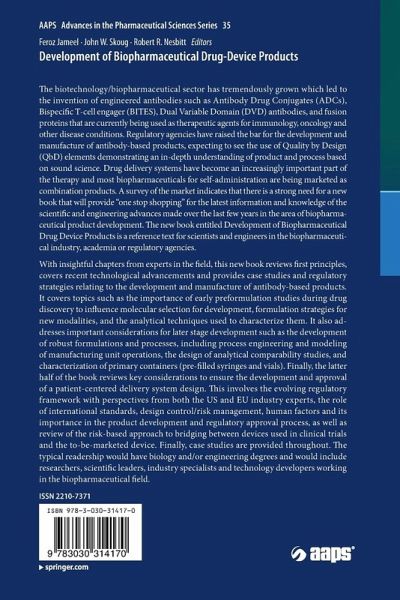 The biotechnology/biopharmaceutical sector has tremendously grown which led to the invention of engineered antibodies such as Antibody Drug Conjugates (ADCs), Bispecific T-cell engager (BITES), Dual Variable Domain (DVD) antibodies, and fusion proteins that are currently being used as therapeutic agents for immunology, oncology and other disease conditions. Regulatory agencies have raised the bar for the development and manufacture of antibody-based products, expecting to see the use of Quality by Design (QbD) elements demonstrating an in-depth understanding of product and process based on sound science. Drug delivery systems have become an increasingly important part of the therapy and most biopharmaceuticals for self-administration are being marketed as combination products. A survey of the market indicates that there is a strong need for a new book that will provide "one stop shopping" for the latest information and knowledge of the scientific and engineering advances madeoverthe last few years in the area of biopharmaceutical product development. The new book entitled Development of Biopharmaceutical Drug Device Products is a reference text for scientists and engineers in the biopharmaceutical industry, academia or regulatory agencies. With insightful chapters from experts in the field, this new book reviews first principles, covers recent technological advancements and provides case studies and regulatory strategies relating to the development and manufacture of antibody-based products. It covers topics such as the importance of early preformulation studies during drug discovery to influence molecular selection for development, formulation strategies for new modalities, and the analytical techniques used to characterize them. It also addresses important considerations for later stage development such as the development of robust formulations and processes, including process engineering and modeling of manufacturing unit operations, the design of analytical comparability studies, and characterization of primary containers (pre-filled syringes and vials).Finally, the latter half of the book reviews key considerations to ensure the development and approval of a patient-centered delivery system design. This involves the evolving regulatory framework with perspectives from both the US and EU industry experts, the role of international standards, design control/risk management, human factors and its importance in the product development and regulatory approval process, as well as review of the risk-based approach to bridging between devices used in clinical trials and the to-be-marketed device. Finally, case studies are provided throughout.The typical readership would have biology and/or engineering degrees and would include researchers, scientific leaders, industry specialists and technology developers working in the biopharmaceutical field.